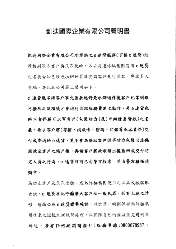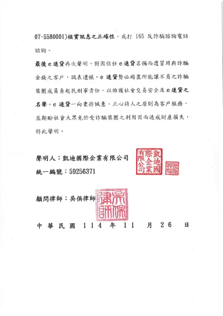 e速貸款已默默耕耘近二十年,對客戶一直秉持著誠心且正心待人的理念,深受客戶信任。但近日有仿冒者想利用我們累積至今的信任,賺取非法的錢財,為了讓客戶不再受騙,我們特此發此聲明,並公布這位仿冒者的資訊,請大家切勿受騙上當。